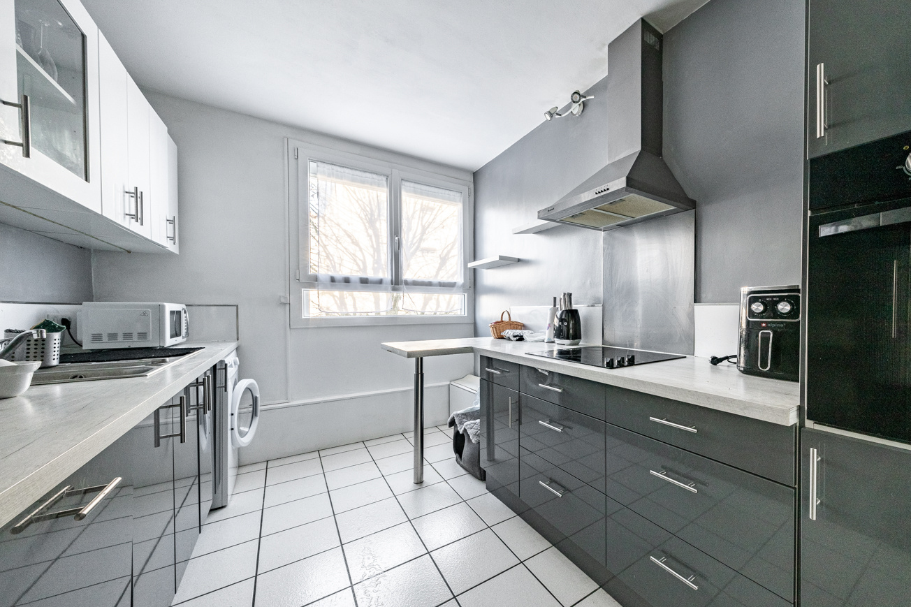 L’entrée carrelée dessert une cuisine équipée avec grande fenêtre, un séjour lumineux ouvrant sur un balcon, ainsi qu’un dégagement avec rangements.